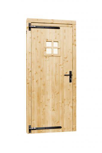 1045635 Vuren dichte enkele deur met ruitje 90x201 cm, linksdraaiend, zwarte hengen, zwart beslag, o