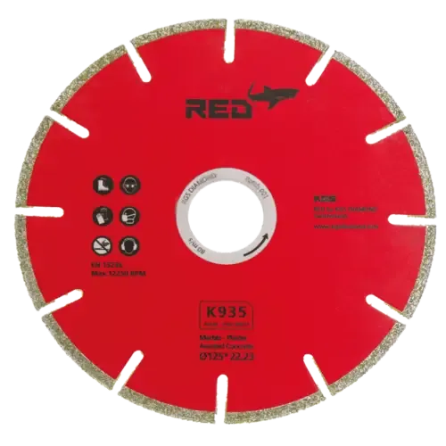 De zaag heeft een diameter van 125 mm met een asgat van 22,23 mm (7/8"). De KGS RED™ K935 diamantzaag heeft segmenten met een hoogte van 2,5 mm en een breedte van 3 mm. De zaag is comfortabel, veilig en gemakkelijk te gebruiken.