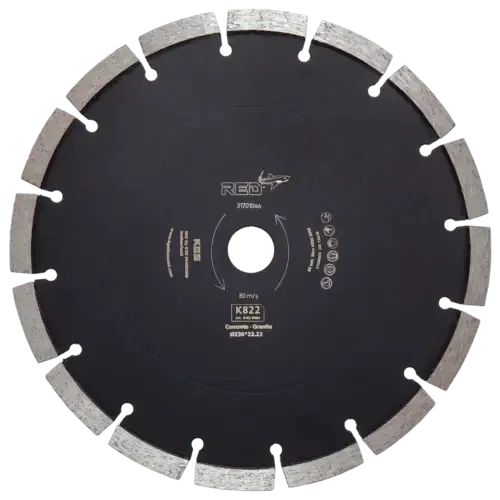KGS RED™ K822 diamantzaag is voor het zagen van beton, bakstenen, tegels, graniet, composiet en kalkzandsteen. Een universele zaag voor de bouw, zaagt snel en agressief. Geschikt voor droog gebruik op een haakse slijper. De zaag heeft een diameter van 230 mm met een asgat van 22,23 mm (7/8"). De KGS RED™ K822 diamantzaag heeft lasergelaste segmenten met een hoogte van 12 mm en een dikte van 2,8 mm. De zaag is ontworpen om stof en spaanders tijdens het zagen gemakkelijk te verwijderen.
