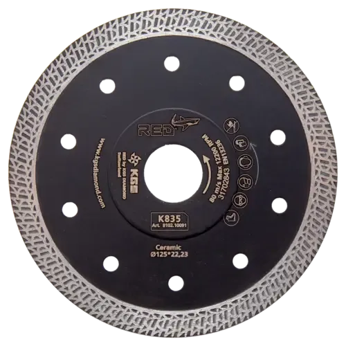 De zaag heeft een diameter van 125 mm met een asgat van 22,23 mm (7/8"). De KGS RED™ K835 diamantzaag heeft segmenten met een hoogte van 10 mm en een dikte van 1,4 mm met een zeer lange levensduur.