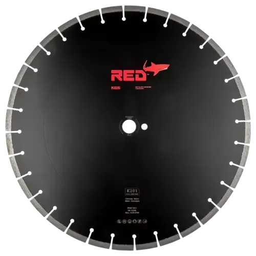 De KGS RED™ K201 zaag heeft een diameter van 450 mm met een asgat van 25,4 mm. De zaag heeft 32 lasergelaste segmenten met een hoogte van 10 mm en een dikte van 3,2 mm. De ruimte tussen de segmenten zorgt voor een zuivere zaagsnede.