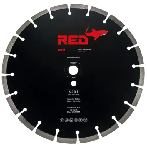 De KGS RED™ K201 zaag heeft een diameter van 300 mm met bussen voor de asmaten 30, 25,4 en 20 mm. De zaag heeft 20 lasergelaste segmenten met een hoogte van 10 mm en een dikte van 3 mm. De ruimte tussen de segmenten zorgt voor een zuivere zaagsnede.