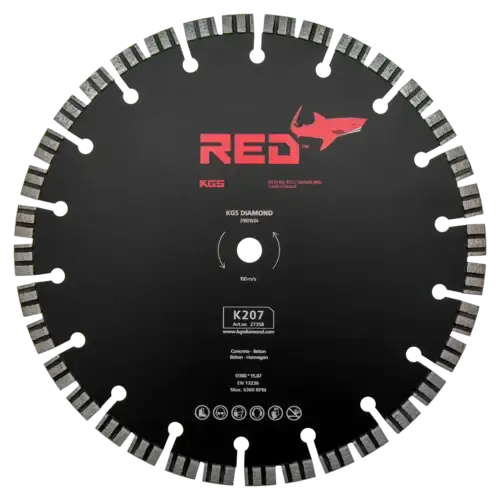 De KGS RED™ K207 diamantzaag heeft een diameter van 300 mm met een asgat van 15,87 mm (5/8"). De zaag heeft 36 duosegmenten met een hoogte van 10 mm en een dikte van 2,4 mm.
