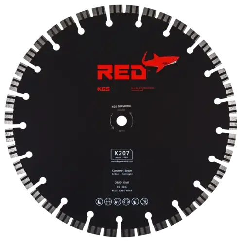 De KGS RED™ K207 zaag heeft een diameter van 350 mm met een asgat van 15,87 mm (5/8"). De zaag heeft 42 duo segmenten met een hoogte van 10 mm en een dikte van 2,4 mm. De duo segmenten zorgen voor betere prestaties, koeling en materiaalafname. Dankzij de dikte van 2,4 mm kun je met deze diamantzaag nog sneller zagen.