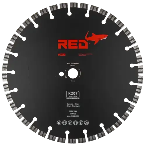 De KGS RED™ K207 zaag heeft een diameter van 350 mm met een asgat van 25,4 mm. De zaag heeft 42 duo segmenten met een hoogte van 10 mm en een dikte van 2,4 mm. De duo segmenten zorgen voor betere prestaties, koeling en materiaalafname. Dankzij de dikte van 2,4 mm kun je met deze diamantzaag nog sneller zagen.
