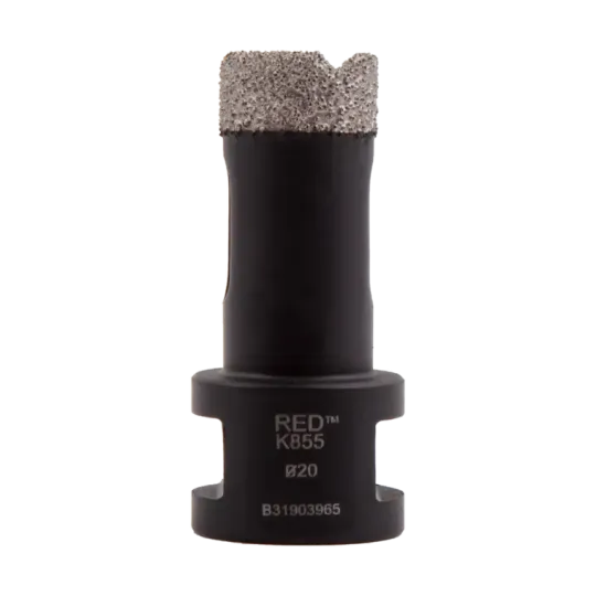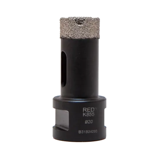 Sterke, vacuüm gesoldeerde diamantboor. Perfect voor het boren van gaten in keramiek, composiet en natuursteen. De boor heeft een lange levensduur en is voorzien van koelgaten. De KGS RED™ K855 boor heeft een M14 aansluiting, waardoor deze eenvoudig op een haakse slijper te installeren is.