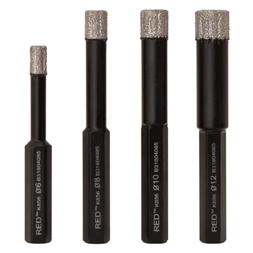 Set van vier sterke, vacuüm gesoldeerde diamantboren. Ideaal voor het snel en moeiteloos boren van gaten in keramiek, composiet en natuursteen. De boren hebben een lange levensduur en zijn aan de binnenkant gewaxt om de wrijving te verminderen voor extra koeling. De set bestaat uit vier KGS RED™ K856 boren in de diameters 6, 8, 10 en 12 mm. De boren hebben een zeshoekige verbinding, waardoor ze eenvoudig op een boormachine te monteren zijn.