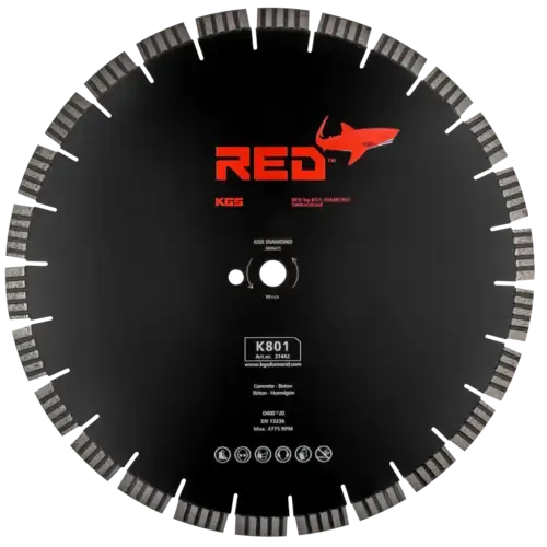 De KGS RED™ K801 zaag heeft een diameter van 400 mm met een asgat van 20 mm. De zaag heeft 24 turbosegmenten met een hoogte van 15 mm en een dikte van 3,2 mm. De extra hoge 15 mm turbo segmenten zorgen voor nog snellere en preciezere zaagsneden.