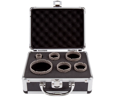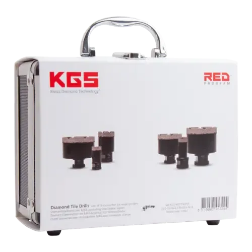De set bestaat uit zes KGS RED™ K855 boren in de diameters 20, 35, 38, 43, 50 en 68 mm. De boren zijn verpakt in een handige draagkoffer. Dankzij de M14 aansluiting zijn de KGS RED™ K855 diamantboren eenvoudig te installeren op een haakse slijper. De lengte/boordiepte van de boor is 40 mm, met een toerental van 11000 rpm. De set is geschikt voor droog gebruik.