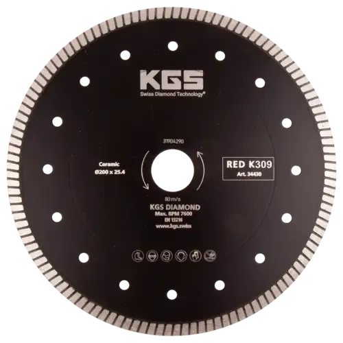 KGS RED™ K309 diamantzaag voor tegelsnijmachines. De zaag heeft een uitstekende levensduur en zorgt voor een dunne en nauwkeurige zaagsnede. Geschikt voor het nat zagen van graniet, composiet, keramiek, porselein en terrazzo.