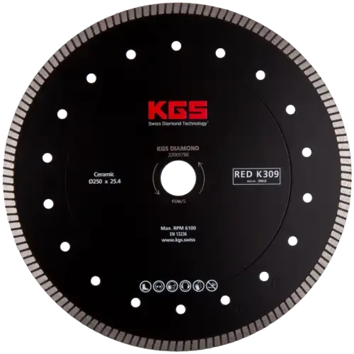 KGS RED™ K309 diamantzaag voor tegelsnijmachines. De zaag heeft een uitstekende levensduur en zorgt voor een dunne en nauwkeurige zaagsnede. Geschikt voor het nat zagen van graniet, composiet, keramiek, porselein en terrazzo.