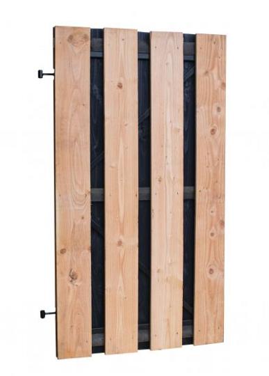 Douglas fijnbezaagde plankendeur op zwart verstelbaar stalen frame. 100x180 cm, planken 1,9x19,5 cm. Binnenzijde planken zwart gecoat. RVS geschroefd.